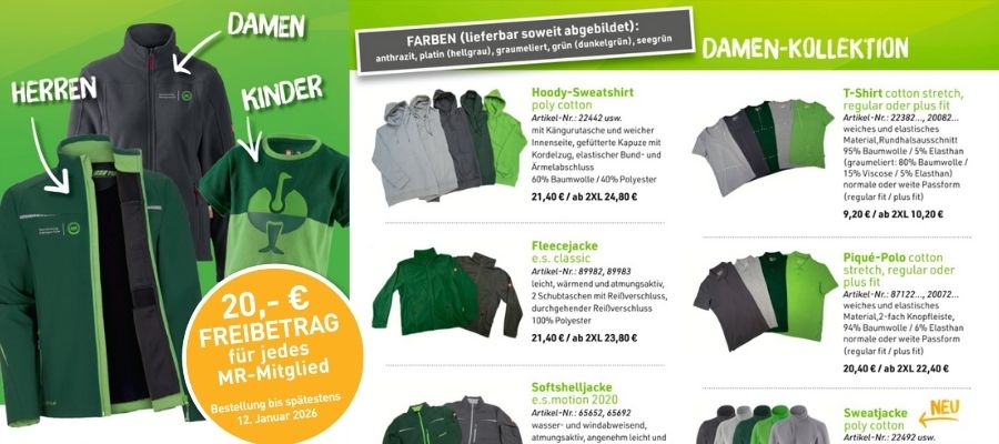 Gemeinsam mit Engelbert Strauss liefern wir eine große Auswahl an qualitativ guten und angenehm zu tragenden Kleidungsstücken, in verschiedenen Farben und mit kleinem aufgesticktem MR-Logo. Die Artikel sind dieselben wie letztes Mal, bei der Damenkollektion haben wir jedoch das Polo Longsleeve durch eine lässige Sweatjacke mit ZIP-Kragen ersetzt. Nutzen Sie auch dieses Mal unseren Freibetrag von 20 Euro pro MR-Mitglied.