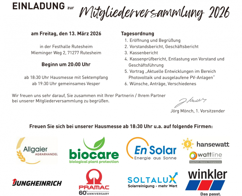 Zu unserer diesjährigen Mitgliederversammlung am Freitag, 13.03.2026 um 20 Uhr in der Festhalle in Rutesheim laden wir herzlich ein.